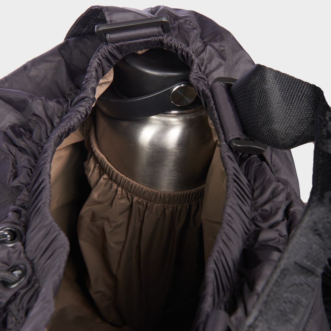 - Interior two-sided elasticized water bottle holder